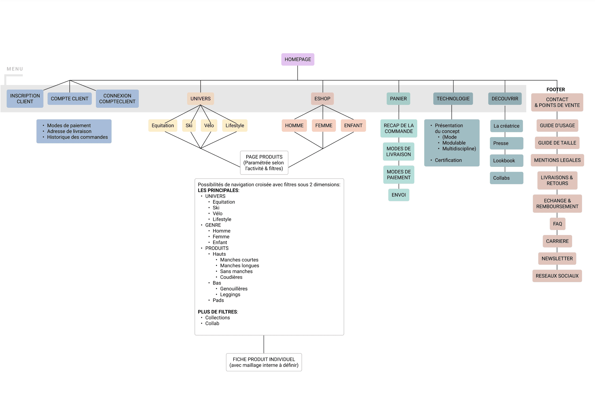 - Cette structure facilite la navigation de l'utilisateur avec des codes familiers propres aux sites e-commerce. Il peut effectuer des recherches par univers (activités) ou par genre, et ajuster ses choix sur une même page.